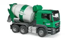 This MAN TGS Cement Mixer is the perfect all-round vehicle for construction sites, long-haul deployment and local distribution. The two-tone cab features doors that can open. Turn the truck mixer drum using the hand crank on the water tank. Just like the real thing, the drum is emptied by reversing its direction of rotation. The spiral on the inside of the drum delivers the load to the discharge chute at the rear. Includes two additional drain chutes!