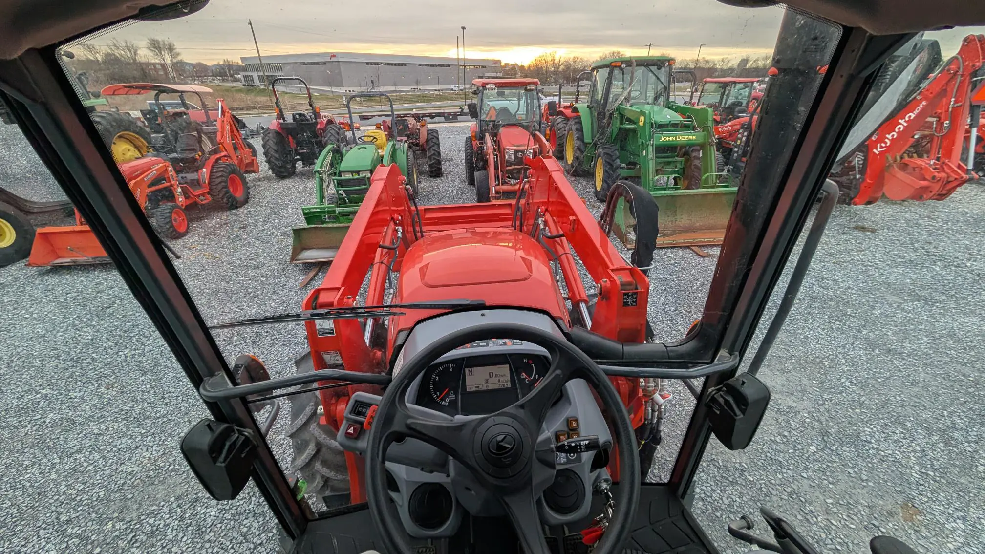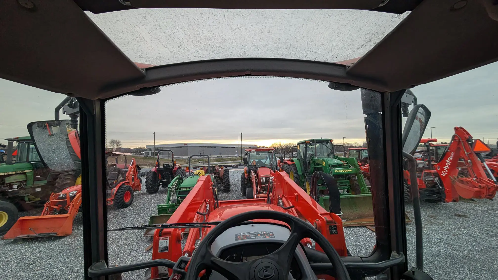 - High Visibility Roof Panel: The curved upper windshield and sunroof enhance upward visibility, especially useful when using pallet forks or stacking bales with the loader.
