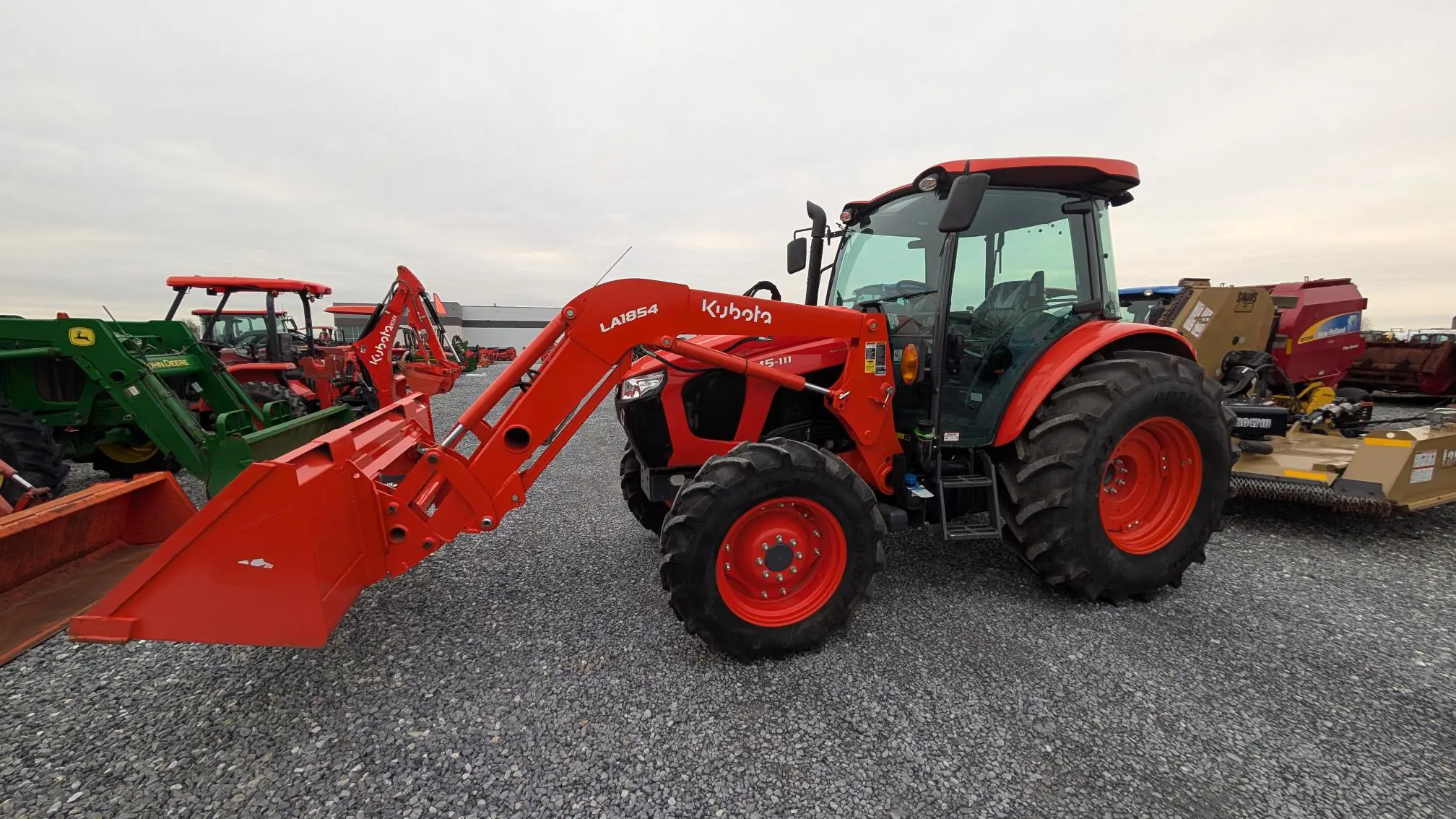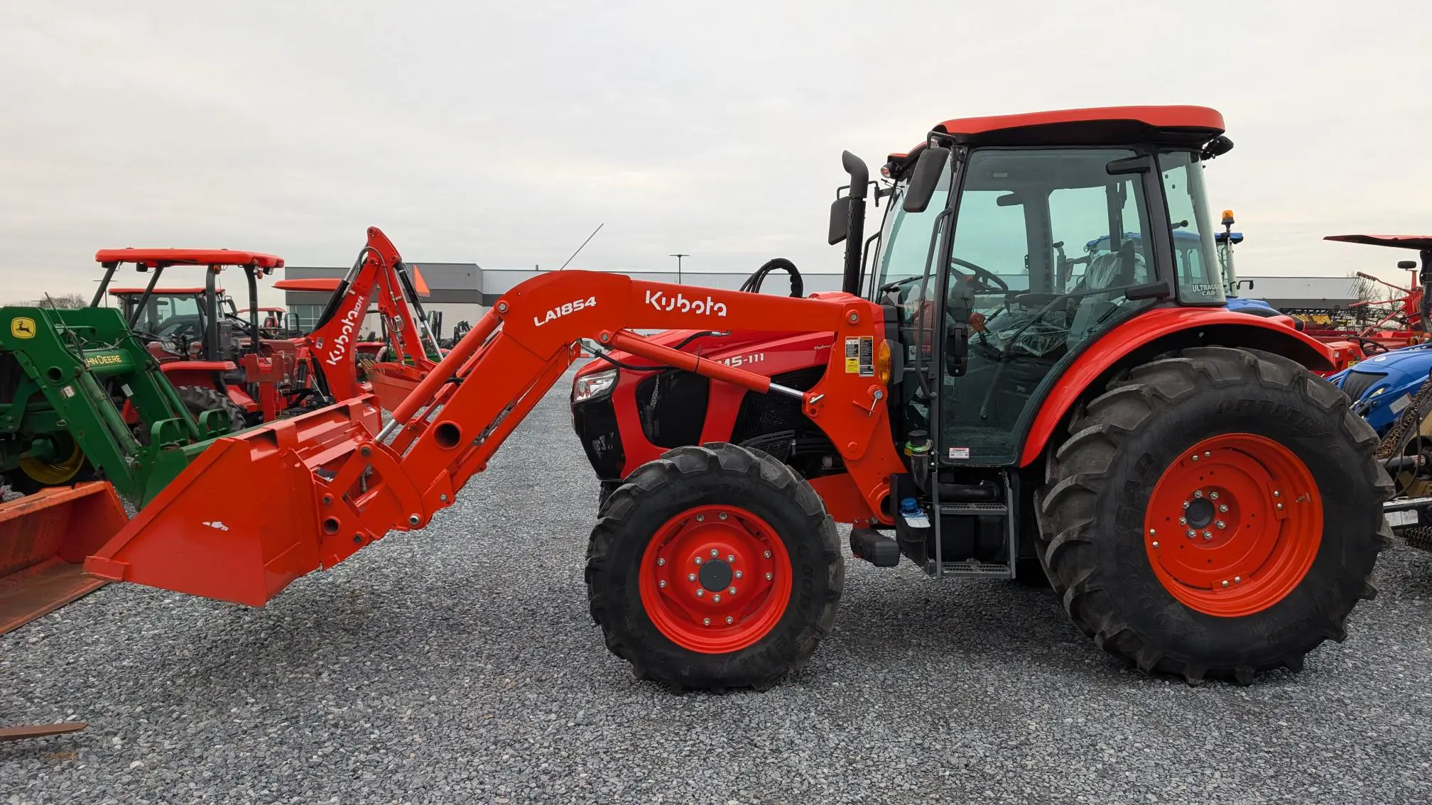 The LA1854 front loader is designed to match the M5 Series, ensuring precise operation and enhanced productivity. Equipped with a standard front loader valve and lever, the loader boasts impressive lift capacity and lift height for top-notch performance.