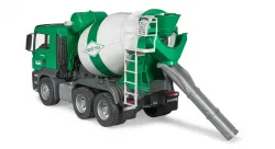 This MAN TGS Cement Mixer is the perfect all-round vehicle for construction sites, long-haul deployment and local distribution. The two-tone cab features doors that can open. Turn the truck mixer drum using the hand crank on the water tank. Just like the real thing, the drum is emptied by reversing its direction of rotation. The spiral on the inside of the drum delivers the load to the discharge chute at the rear. Includes two additional drain chutes!