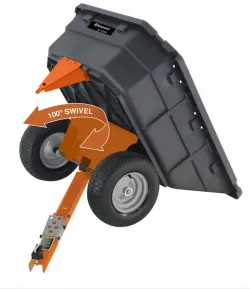 - Upon activation of the step-on dump release pedal, the utility cart's bed tilts and swivels to empty the load anywhere within a 105 degree radius.