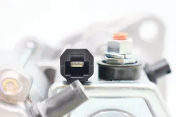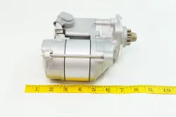 Important: Disconnect the battery first. The starter is secured by two nuts, and a socket extension helps reach the inboard nut for both removal and replacement. The two electrical connections are easy.