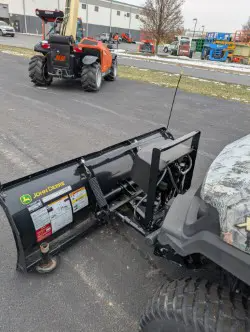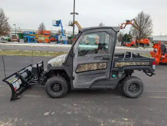 2018 John Deere Gator, 304 hours, Diesel, Cab w/ AC & Heat, Radio, 4wd w/ diff. lock, front & rear work lights, Power dumping Bed, 72" hydraulic angle snow plow, camo graphics on hood are faded.